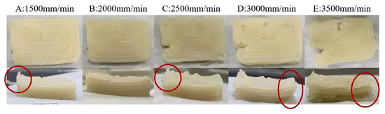 The print speed was set to 2500 mm/min at 25 °C, and samples were produced with different nozzle diameters (4.0, 1.5 and 0.8 mm) to assess their impact on print quality. Printing was conducted at a speed of 2500 mm/min with a nozzle diameter of 1.5 mm at various temperatures (25, 30, 35 and 40 °C) to assess temperature effects. Printing speeds were set as 1500, 2000, 2500, 3000 and 3500 mm/min (with a 1.5 mm nozzle and at 25 °C) to assess the effect of printing speed.