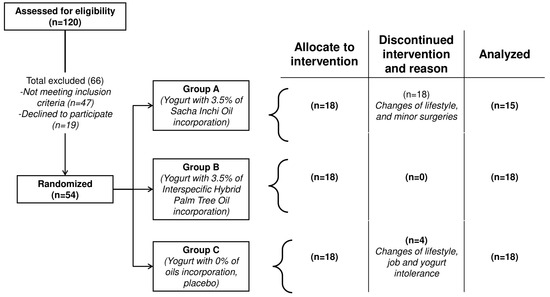 Yogurts were prepared according with our previous study [5] at the Institute of Food Science and Technology at Universidad Nacional de Colombia, Bogota. All eligible subjects were randomly assigned into 3 groups (A, B, and C). Subjects in the three groups were provided with 200 g of 3.5% fat yogurts per day for 3 months (12-weeks, 90 days). Group A subjects were given yogurt with fat from locally produced Sacha Inchi oil; Group B subjects were provided with yogurt containing fat from Colombian hybrid palm oil; and the control (C) group was given yogurt with unreplaced milk fat (standard yogurt). Nutrition facts in a serving size of 200 g of yogurt are shown in Table 1 and its safety information is given in Appendix A and Appendix B. All participants were asked to keep their usual diets, avoiding the intake of other fermented dairy products and maintaining their usual exercise routines.