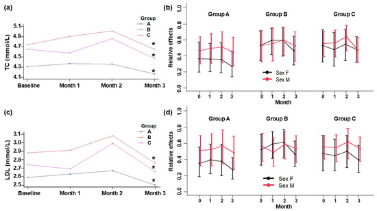 Although there were no significant differences between groups, within groups, the plasma TC (p < 0.001) and LDL-C (p = 0.001) levels decreased. Within Groups A and B, the values of these markers increased during the first and second months and decreased in the third one, whereas in Group C, the values increased in the second month and decreased in the first and third months.