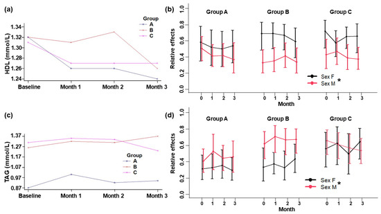 Plasma levels of HDL-cholesterol (a) and triacylglycerols (c). Relative effects of plasma HDL-cholesterol (b) and triacylglycerols (d) in adult subjects at baseline and 1, 2, and 3 months of intervention. Group A: Yogurt with SIO. Group B: Yogurt with HPO. Group C: Yogurt control (placebo). Data are means ± standard deviation. * Indicates a significant difference by sex (p ≤ 0.05).