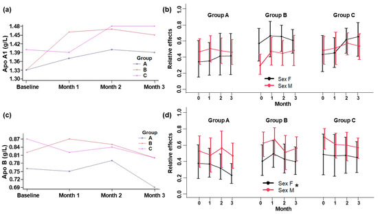 Plasma levels of Apolipoprotein A1 (a) and Apolipoprotein B (c). Relative effects of plasma Apolipoprotein A1 (b) and Apolipoprotein B (d) in adult subjects at baseline and 1, 2, and 3 months of intervention. Group A: Yogurt with SIO. Group B: Yogurt with HPO. Group C: Control yogurt (placebo). Data are means ± standard deviation. * Indicates a significant difference by sex (p ≤ 0.05).