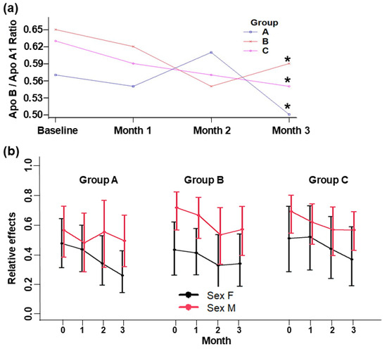 ApoB/ApoA1 ratios (a) and relative effects of ApoB/ApoA1 ratios (b) in adult subjects at baseline and 1, 2, and 3 months of intervention. Group A: Yogurt with SIO. Group B: Yogurt with HPO. Group C: Control yogurt (placebo). Data are means ± standard deviation. * Indicates a significant difference within groups (p ≤ 0.05).