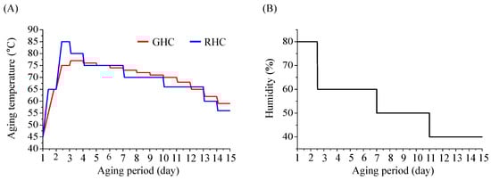 Aging conditions for black garlic (BG) manufacturing under different temperature protocols. (A) Temperature changes during the aging process. (B) Humidity changes during the aging process. The same humidity conditions were applied to both GHC and RHC groups (80%-60%-50%-40%). GHC and RHC refer to gradual heating and cooling and rapid heating and cooling, respectively.