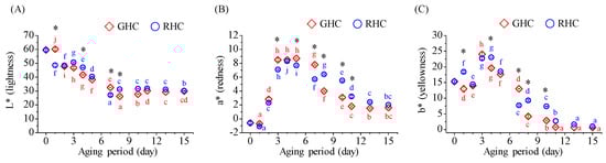 Changes in color metrics (lightness, redness, and yellowness) of BG during the 15-day aging process under two temperature protocols: GHC (gradual heating and cooling) and RHC (rapid heating and cooling). (A) Lightness (L*) values. (B) Redness (a*) values. (C) Yellowness (b*) values. Data are presented as mean ± SD from three independent experiments. Different letters indicate statistically significant differences within the same treatment group, as assessed by Duncan’s multiple range test (p < 0.05). A star symbol (*) indicates a significant difference between the two groups (GHC and RHC).