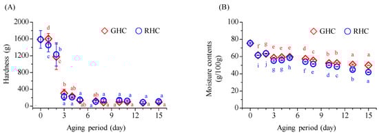 Changes in hardness and moisture content of BG during the 15-day aging period under two temperature protocols: GHC (gradual heating and cooling) and RHC (rapid heating and cooling). (A) Hardness values. (B) Moisture content values. Data are presented as mean ± SD from three independent experiments. Different letters indicate statistically significant differences within the same treatment group, as assessed by Duncan’s multiple range test (p < 0.05).