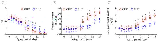 Changes in pH, fructose content, and total polyphenol content of BG during the 15-day aging period under two temperature protocols: GHC (gradual heating and cooling) and RHC (rapid heating and cooling). (A) pH values. (B) Fructose content. (C) Total polyphenol content. Data are presented as mean ± SD from three independent experiments. Different letters indicate statistically significant differences within the same treatment group, as assessed by Duncan’s multiple range test (p < 0.05). A star symbol (*) indicates a significant difference between the two groups (GHC and RHC).