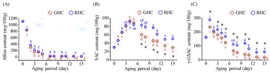 Changes in alliin, S-allylcysteine (SAC), and γ-glutamyl-S-allylcysteine (γ-GSAC) content in garlic during a 15-day aging period under two temperature protocols: GHC (gradual heating and cooling) and RHC (rapid heating and cooling). (A) Alliin content. (B) SAC content. (C) γ-GSAC content. Data are presented as mean ± SD from three independent experiments. Different letters indicate statistically significant differences within the same treatment group, as assessed by Duncan’s multiple range test (p < 0.05). A star symbol (*) indicates a significant difference between the two groups (GHC and RHC).