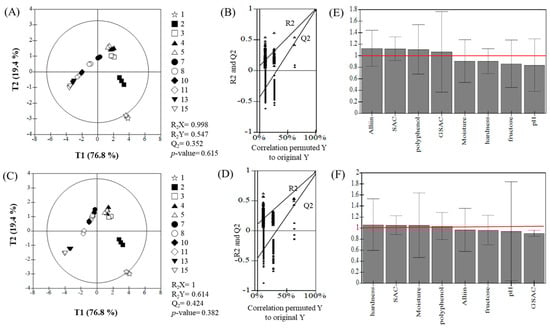 Despite showing similar overall trends between the two treatment conditions, samples aged for 1 day and 10 days displayed clear distinctions from other samples along both the T1 and T2 axes (Figure 6). The PLS-DA model was validated using R2X, R2Y, Q2, and p-values, yielding the following results: GHC had R2X = 0.998, R2Y = 0.547, Q2 = 0.352, with a p-value of 0.615 (Figure 6A,B); RHC had R2X = 1, R2Y = 0.614, Q2 = 0.424, with a p-value of 0.382 (Figure 6C,D). These results indicate that the T1 factor provided the most significant differentiation between samples. The Variable Importance in Projection (VIP) values for the key factors were above 1.0, highlighting the components most influenced by the aging conditions (Figure 6E,F): for GHC, these included alliin, SAC, polyphenols, and GSAC; for RHC, they included hardness, SAC, moisture, and polyphenols. The PLS-DA analysis thus confirms that even slight differences in aging conditions can significantly impact the changes in major physicochemical components of BG.