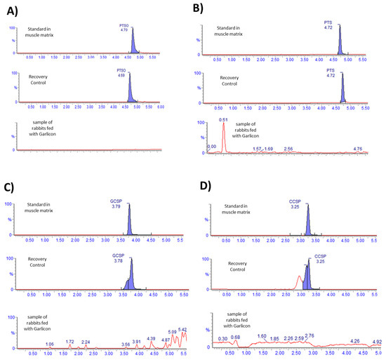 Chromatograms of (A) PTSO, (B) PTS, (C) GSSP, and (D) CSSP. Each compound is found in three different situations: the standard in matrix, doped and extracted samples (recovery control), and samples of rabbit muscle fed with Allium extract. Retention times are shown for every compound.