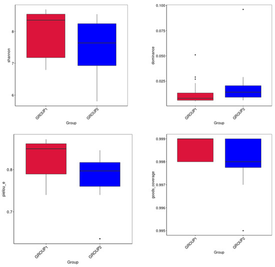 Boxplots of the alpha-diversity indices (Shannon index; Dominance; Pielou’s evenness; and Goods coverage) calculated using specific species abundance data from rabbits fed with Allium extract (Group 1 in red) and control (Group 2 in blue).