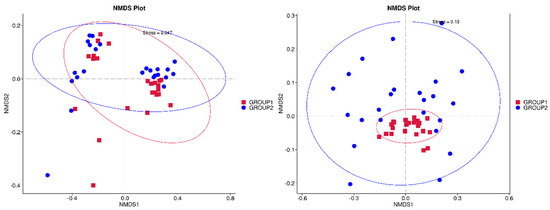 Additionally, NMDS plots were generated to illustrate the distribution of microbiomes between the two groups (Figure 4). The NMDS diagrams revealed significant differences in microbiome composition, with minimal overlap between the Allium-supplemented group (red squares) and the control group (blue circles). The Allium group showed a more distinct cluster, particularly along the NMDS1 axis. Panel 1, with a stress value of 0.047, provides a highly reliable representation, while Panel 2, with a stress value of 0.13, also shows clear separation. The distinct clustering and consistency between panels confirm robust differences in microbial composition.