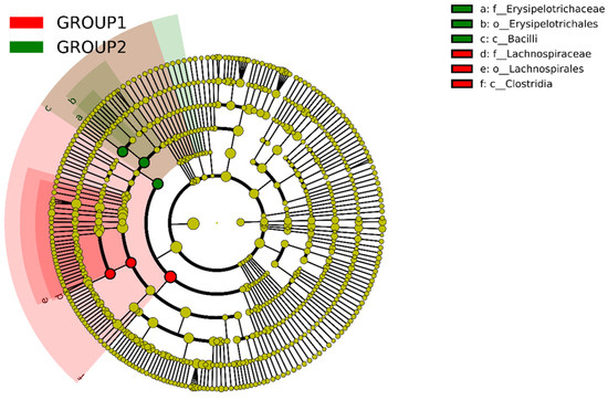 The cladogram highlights nodes by their dominance, with red representing the Allium group and green representing the control group. The phylogenetic analysis of gut microbiota revealed compositional differences between the Allium-supplemented group (Group 1) and the control group (Group 2). Particularly, the Allium group exhibited a higher abundance of taxa within the families Lachnospiraceae and the orders Lachnospirales and Clostridia, as indicated by the red nodes and shaded regions. On the other hand, the control group had a greater prevalence of taxa of the families Erysipelotrichaceae, the order Erysipelotrichales, and the class Bacilli, as shown by the green nodes. These findings highlight the significant impact of Allium supplementation on the gut microbial community structure, suggesting potential implications for host health and metabolic processes. The minimal overlap between groups underscores the robustness of these dietary effects.