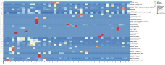 Heatmap showing the relative abundance of bacterial species in rabbits fed with Allium extract (Group 1) and control (Group 2). Columns represent individual samples, and rows represent bacterial species, with color intensity indicating the abundance level (red for high abundance, blue for low abundance). Taxonomic groups are labeled on the right, highlighting differences in microbial composition between the two groups. This visualization underscores the variability and differential abundance of specific bacterial taxa influenced by dietary treatments.