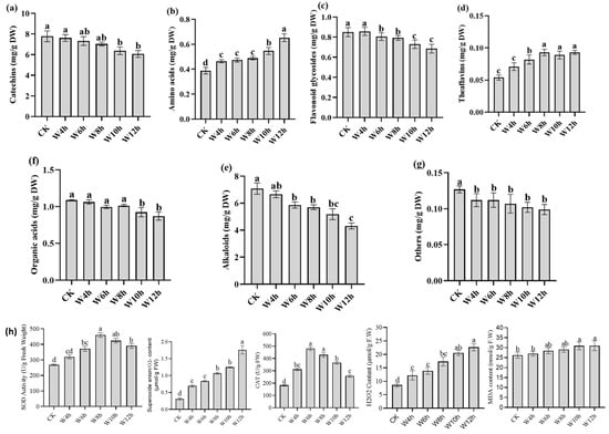 Relative content of the main metabolites under different withering times. (a) Catechins, (b) amino acids, (c) flavonoid glycosides, (d) theaflavins, (e) alkaloids, (f) organic acids, (g) others, and (h) enzymes activity during withering process. Data are presented as mean ± SD (n = 3), and a significant difference is shown by different letters with a threshold p < 0.05, according to Duncan’s test.