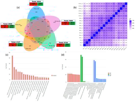 Differentially expressed genes (DEGs) in five groups. (a) The identification of DEGs in five groups, where the cross-sectional region shows the shared DEGs. (b) Pearson’s correlation between the samples. (c) The first 20 significantly enriched pathways (KEGG) in the comparative combination of withering time across all samples. (d) Gene Ontology (GO) enrichment analysis across all samples. DEGs were defined using adjusted p−value < 0.05 and a |fold-change| > 1.5 as a cut-off.