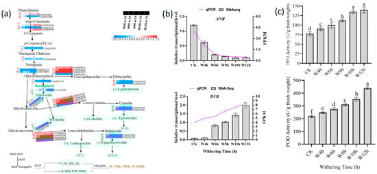Catechins play an essential role in tea polyphenols and have an important influence on the quality and function of tea []. In this research, the content of flavan-3-ol (catechins) gradually decreased with the increase in withering time, due to the downregulation of the DEGs involved in catechins metabolism (Figure 3a). The different DEGs encoding enzymes involved in the biosynthesis and oxidation of catechins were examined, and 18 DEGs were detected, including gene encoding PAL (phenylalanine ammonia-lyase), C4H (cinnamate-4-hydroxylase), TT4 (chalcone synthase), TT5 (chalcone isomerase), TT7 (flavonoid 3’-monooxygenase), F3H (flavanone 3-hydroxylase), DFR (dihydro flavonol 4-reductase), ANR (anthocyanidin reductase), and FLS (flavonol synthase) (Figure 3a). The ANR involved in the formation of flavan-3-ol monomers, such as C, EC, and EGC, gradually decreased (Figure 3a). The reduction in quercetin content was caused by its associated DEGs (CSS0007745, novel.8182), which demonstrated downregulation during withering, especially in CK and W4h (Figure 3a).