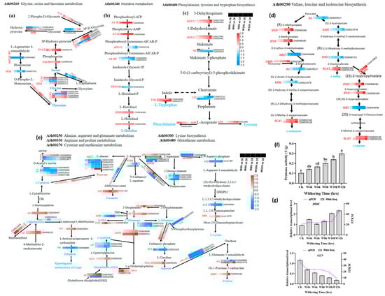 The differentially expressed genes (DEGs) involved in amino acid formation during the withering process. (a) Glycine, serine and threonine metabolism; (b) histidine metabolism; (c) phenylalanine, tyrosine, and tryptophan biosynthesis; (d) valine, leucine, and isoleucine biosynthesis; (e) alanine, aspartate, and glutamate metabolism; arginine and proline metabolism; cysteine and methionine metabolism; lysine biosynthesis; (f) protease activity; (g) the validation of RNA-seq by RT-qPCR. The column charts represent values of RNA-seq, and the lines represent RT-qPCR values. Statistical significance of DEGs was defined using adjusted p-value < 0.05 and |fold-change “FC” | > 1.5 as a cut-off.