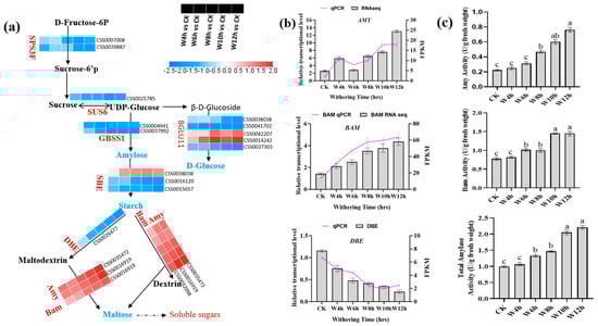 Based on KEGG pathways analysis, our study reveals that starch and sucrose metabolism were the first enriched pathways (Figure 2c). At the withering stage, a total of 17 DEGs encoding the essential enzymes related to the metabolism of starch and sucrose were found, such as genes (CSS0035472, CSS0016919) encoding alpha-amylase (AMY), which acted as endohydrolase, and the gene (CSS0032098) encoding beta-amylase (BAM), which acted as exohydrolase; AMY and BAM were upregulated during withering (Figure 5a). Consequently, they influenced the increase in starch monomers, such as maltose, as withering time increased. These genes play a key role in the decomposition of starch during black tea processing, as revealed in our previous studies []. AMY triggers the decomposition of starch to produce malto-oligosaccharides, while BAM catalyzes the α-1,4-glucosidic linkages of starch to produce β-maltose derived from the non-reducing part []. Other research showed that withering dehydration stress initiates gene expression and causes the starch-related genes to respond to the water deficit by providing energy and carbon to sustain photosynthesis process [,].