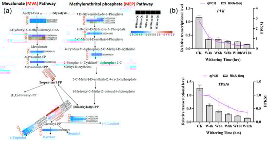 (a) The differentially expressed genes (DEGs) involved in terpenoid backbone biosynthesis during withering process; (b) Validation of RNA−seq by RT−qPCR; column charts represent values of RNA−seq, and lines represent RT−qPCR values. HMGS, hydroxymethylglutaryl−CoA synthase; HMG1, hydroxy methylglutaryl CoA reductase 1; MK, mevalonate kinase; PVK, phosphomevalonate kinase; MVD1, mevalonate diphosphate decarboxylase 1; DXPS1, 1−deoxy-D-xylulose 5−phosphate synthase 1; DRX, 1−deoxy-D-xylulose 5-phosphate reductoisomerase; CDPD, 4−(cytidine 5’-phospho)-2-C-methyl-D-erithritol kinase; GGPS6, geranylgeranyl pyrophosphate synthase 6; TPS10, terpene synthase 10; TPS14, terpene synthase 14; TPS−CIN, terpene synthase-like sequence-1,8-cineole. Statistical significance of DEGs was defined using the adjusted p-value < 0.05 and |fold-change “FC” | > 1.5 as a cut-off.