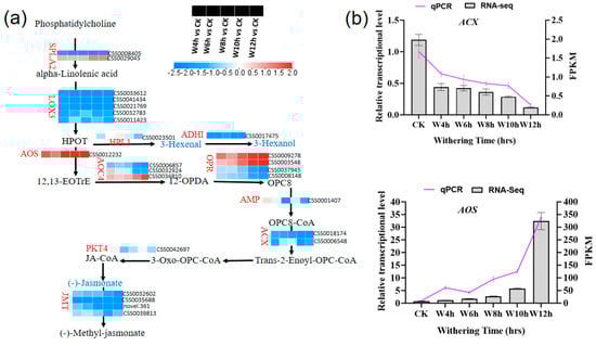 (a) Simplified model of DEGs involved in α−linolenic acid metabolism during withering process. (b) Validation of RNA-seq by RT−qPCR; column charts represent values of RNA−seq, and lines represent RT−qPCR values. PLA2−ALPHA, secretory phospholipase A2; LOX3, lipoxygenase; HPL1, hydroperoxide lyase 1; ADH1, alcohol dehydrogenase class−P, AOS, hydroperoxide dehydratase; AOC4, allene oxide cyclase 4; OPR, Oxophytodienoic acid reductase; AMP, AMP-dependent synthetase and ligase family protein; ACX, acyl−CoA oxidase; PKT4, peroxisomal 3−ketoacyl−CoA thiolase 4; JMT, jasmonate O−methyltransferase. Statistical significance of DEGs was defined using the adjusted p−value < 0.05 and |fold-change “FC” | > 1.5 as a cut−off.