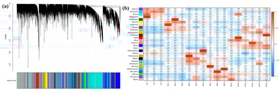 Weighted gene co-expression network analysis (WGCNA) of the genes during the withering process. (a) Cluster dendrogram displaying the hierarchical cluster tree with each leaf representing a single gene and the co−expression modules revealed by WGCNA. (b) The correlations between samples and modules where every row represents a single module. The color and number of each cell at the row−column intersection indicate the correlation coefficient of the module and sample.
