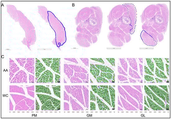 After fixation, the PM was excised and trimmed perpendicular to the direction of the myofiber to create a transverse section along the clavicle to the outer half of the pectoral muscle, which was then placed into an embedding cassette. Similarly, the drumstick was removed after fixation and sectioned at the maximum cross-sectional area to produce a transverse section. Subsequently, the embedding cassettes were dehydrated with gradient alcohol (75, 85, 90, 95%), cleared in xylene, and embedded in paraffin. The paraffin-embedded tissue blocks were cooled during the −20 °C freezing stage and then were cut into 4 µm sections. Following the spreading and baking processes, the sections were stained with hematoxylin and eosin (H&E) and sealed with neutral balsam. The prepared H&E-stained sections were then scanned using a slide scanner (3DHISTECH, Budapest, Hungary) to produce high-resolution, whole-slide images (WSIs).