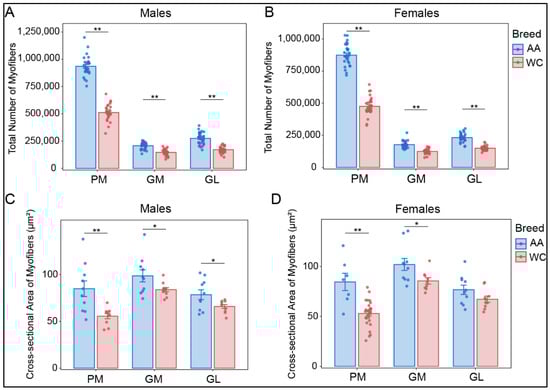 Furthermore, comparative analysis was performed to assess the CSA of muscle fibers in the AA and WC breeds (Table 2). Specifically, the CSA of the PM in AA males was markedly higher than that observed in WC males (p < 0.01) (Figure 2C). The CSAs of the GM and the GL in AA males were higher than those in WC males (p < 0.05) (Figure 2C). The differences in muscle fiber CSA between AA and WC females were similar to those observed in males (Figure 2D).