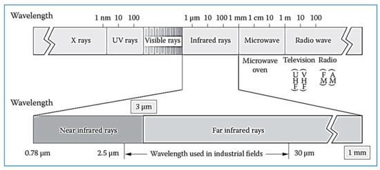 Different wavelengths have been given by different authors as the starting point of IR radiation within the electromagnetic spectrum. IR radiation has been given a wavelength range of 0.75 to 1000 µm [19] and 0.76 to 1000 µm [20], while Tsai et al. [21] gave a range of 0.78 to 1000 µm and further divided IR into three distinct zones: near-infrared (NIR) with a wavelength of 0.78–3.0 μm, mid-infrared (MIR, 3.0–50.0 μm), and far-infrared (FIR, 50.0–1000.0 μm). Figure 1 shows the Electromagnetic spectrum and IR wavelength ranges. Other classifications of the IR spectrum exist, with the division of the IR spectrum into five regions becoming the most predominant scheme. These regions include near-infrared (NIR), short-wavelength infrared (SWIR), mid-wavelength infrared (MWIR), long-wavelength infrared (LWIR), and far-infrared (FIR) [19] as follows: