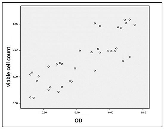 To obtain more precise insights into cell reduction, the present study evaluated biofilm inactivation using viable cell counts in addition to OD. Furthermore, the relationship between biofilm inactivation tests was assessed using simple linear correlation analysis. A scatter plot was generated to examine the relationship between E. coli biofilm inactivation tests. OD values were plotted on the x-axis and viable cell counts on the y-axis (Figure 1). The results revealed a significant positive linear correlation (r = 0.817, p < 0.01) between viable cell counts and OD measurements. The plate counting and OD methods were compared to assess microbial growth. The comparison demonstrated that OD can be an alternative technique for estimating viable cell counts. Microbial growth rates can be inferred from the slopes of the OD profiles. These findings suggest that both inactivation test methods—viable cell counts and OD—help compare sonication treatments. However, analyses based on viable cell counts are recommended, as they provide more accurate inactivation data.