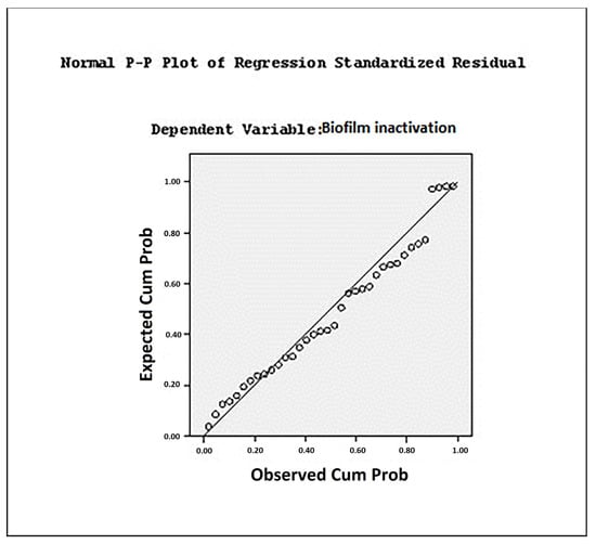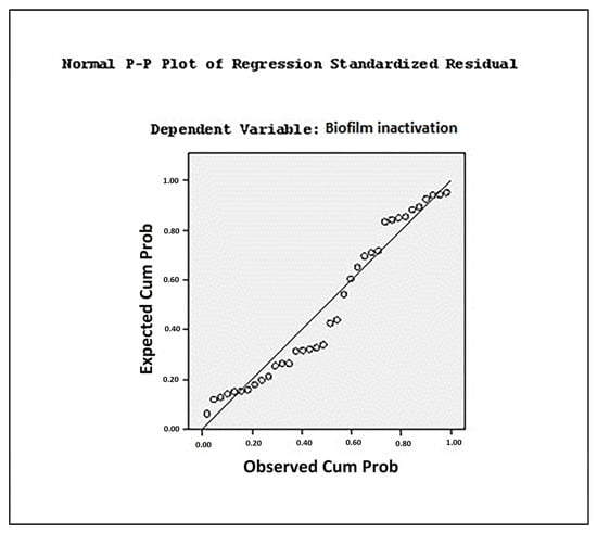 The regression equation model (Equation (4)), which describes the biofilm inactivation rate (%) based on viable cell count, is presented below. Temperature, time, and solution significantly correlated with the biofilm inactivation rate (R = 0.921, R2 = 0.847, Adjusted R2 = 0.833). Collectively, these independent variables explained 84% of the variability in the biofilm inactivation rate. The decontamination efficiency of each variable displayed varying levels of statistical significance. Standardized regression coefficients (β) revealed the relative importance of the independent variables: solution (β = 0.569), time (β = 0.555), and temperature (β = 0.464). Significance tests for the regression coefficients indicated that all independent variables (temperature, time, and solution) had a statistically significant effect (p < 0.01) on the inactivation rate. Additionally, data from viable cell counts indicated that E. coli biofilms were more sensitive to organic acids than other factors.