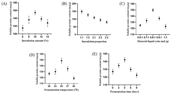 Inoculation amount (A), inoculation proportion (B), material–liquid ratio (C), fermentation temperature (D), and fermentation time (E) on the yield of soluble protein content of FZBS. All tests were performed 3 times. Each data point represents the mean ± SD of triplicates.
