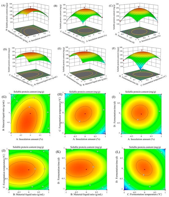 Response surface plots (A–F) and the corresponding contour plots (G–L) showing inoculation amount and material–liquid ratio (A,G); inoculation amount and fermentation temperature (B,H); inoculation amount and fermentation time (C,I); material–liquid ratio and fermentation temperature (D,J); material–liquid ratio and fermentation time (E,K); and fermentation temperature and fermentation time (F,L).