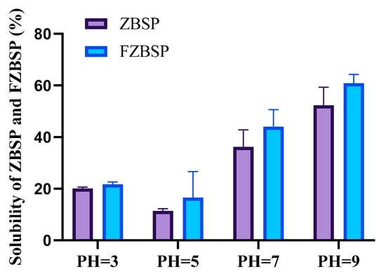 When pH = 3, pH = 5, pH = 7, pH = 39, the solubility of ZBSP and FZBSP. Results are expressed as mean ± SD (n = 3). ZBSP means Zanthoxylum bungeanum seeds protein, and FZBSP means fermented Zanthoxylum bungeanum seeds protein.