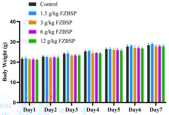 Impact on body weight of mice in FZBSP toxicity. Six mice were randomly selected in each group.