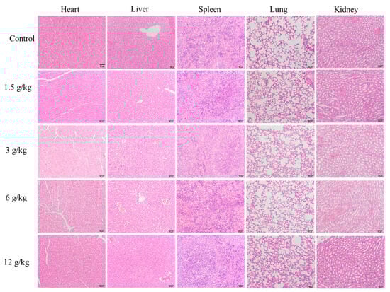 As shown in Figure 6, the mice in the 1.5 g/kg, 3 g/kg, 6 g/kg, and 12 g/kg dose groups showed no significant changes in body weight after 7 days of feeding compared to the blank group (p > 0.05), but a steady increase in body weight was observed throughout the study period. The organ indices of the 1.5 g/kg, 3 g/kg, 6 g/kg, and 12 g/kg dose groups were compared with those of the CON group. As shown in Table 7, there was no significant difference in the organ index between the groups (p > 0.05).