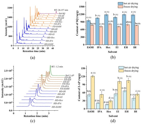 (a) HPLC chromatogram of Squalene (SQ) standard and Pandan leaf extracts; (b) SQ content: the effect of extraction solvents and drying methods; (c) LC-MS/MS chromatogram of 2-acetyl-1-pyrroline (2-AP) standard and Pandan leaf extracts; (d) 2-AP content: the effect of extraction solvents and drying methods. The lowercase letters on the line were expressed as the significance between various extraction systems. The uppercase letters (A and B) were expressed as the significance between hot air drying and freeze drying. Retention time (RT).
