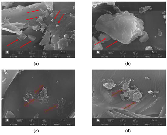 SEM images of leaf cell residues of hot air-dried Pandan powder and freeze-dried Pandan powder before and after ultrasound-assisted extraction at 10,000 magnifications disrupted. Differences can be seen where the red arrows point. (a) hot air-dried and (b) freeze-dried Pandan powder before extraction; (c) hot air-dried and (d) freeze-dried Pandan powder after extraction.