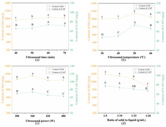 Optimization of UA conditions using single-factor experiments includes A (ultrasound time: 40–70 min), B (ultrasound temperature: 30–60 °C), C (ultrasound power: 300–480 W), and D (solid to liquid ratio: 1:5–1:20 g/mL). The dependent variables were the SQ content and the 2-AP content. Each experiment was conducted in triplicates.