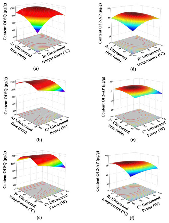 Three-dimensional response surface: (a) and (d) the interaction between ultrasound time and temperature for the content of SQ and 2-AP, respectively; (b) and (e) the interaction between ultrasound time and power for the content of SQ and 2-AP, respectively; (c) and (f) the interaction between ultrasound power and temperature for the content of SQ and 2-AP, respectively.