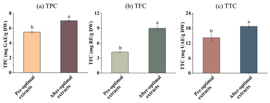 The effect of optimization on TPC, TFC, and TTC in EH Pandan leaf extracts was analyzed. As presented in Figure 5a–c, the TPC, TFC, and TTC of EH Pandan leaf extracts significantly increased after optimization compared to before optimization. This aligns with the research of Zampar [44], who described that UA conditions significantly influence TPC, which ranged from 326.76 to 415.06 mg GAE 100/g with the ultrasound time from 5 to 30 min. A similar trend was also seen in TFC. Additionally, TTC increased with the SQ content after optimization, as SQ is a natural triterpene.