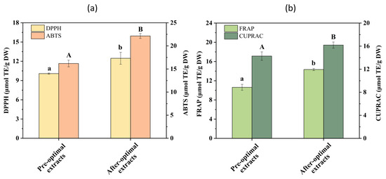 Antioxidant activities in the Pandan leaf extracts of pre-optimization and after optimization determined using DPPH, ABTS radical scavenging assays (a), FRAP, and CUPRAC assays (b). Different letters on the same color figure mean statistically different (p < 0.05).