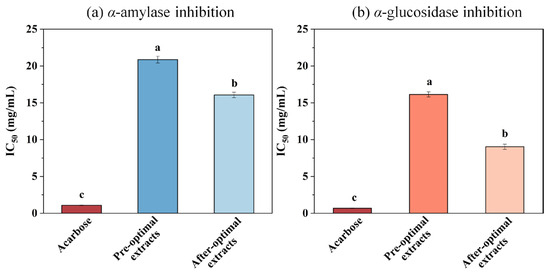 (a) α-amylase and (b) α-glucosidase inhibition (IC50 values in mg/mL, data were obtained from triplicate experiments and expressed as mean ± STD) of acarbose and Pandan leaf extracts before optimization and after optimization. Different letters on the same figure mean statistically different (p < 0.05).