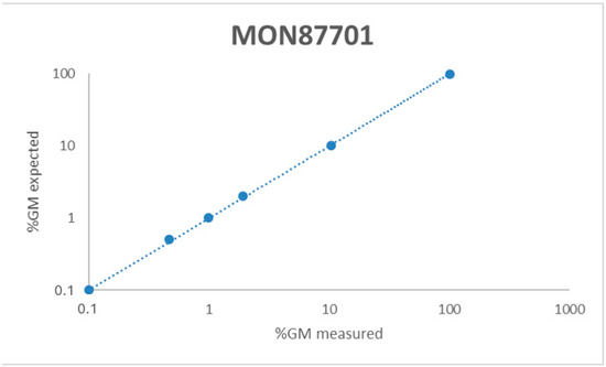 The linearity was evaluated within the dynamic range, observing a directly proportional value to the relative content of the tested GM samples. The degree of linearity within the dynamic range was assessed in terms of the slope and coefficient of determination (R2) by a regression analysis of the expected vs. observed GMO content (%) observed for each of the five runs. R2 as reported in the ENGL guidelines [12,14] should be greater or equal to 0.98, and the slope should be 1± 0.25. All of the duplex assays fulfil the acceptance criteria, exhibiting an R2 of 1 and a slope within the acceptable range (Figure 1 and Table 4).