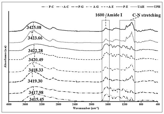 Upon conjugation with PPNs, noticeable shifts and broader spectra were observed. The broad band in the range of 2400–3800 cm−1 suggests the formation of extensive hydrogen bonds between the hydroxyl groups of PPNs and the amine or amide groups of the SSPHs. Compared with UAH and UPH (SSPHs), amide A bands of A–E, A–C, A–G, P–E, P–C, and P–G conjugates had wider peak shapes, and their maximum absorption wave number was shifted to 3300 to 3700 cm−1, respectively, indicating that the PPNs covalently binding to SSPHs, which could strengthen the stability and bioactivity of the conjugated product (Figure 1) [30]. In particular, the appearance of peaks related to C=O stretching vibrations, which are common in ester and carbonyl groups, suggests the occurrence of covalent bonding between PPNs and SPPHs [28]. Supporting the notion of results, similar structural change observation was reported by Pan et al. [26] during the fabrication of conjugates between different PPNs and bovine bone proteins.
