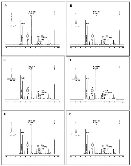 1H-NMR spectra of selected samples are illustrated in Figure 2A–F. Signals at 2.9–3.1 ppm can be attributed to the aliphatic hydrogens adjacent to electronegative atoms, likely present in the protein side chains or hydrolysate backbone [29]. Moreover, the methylene (CH2) groups are near amide or hydroxyl functionalities introduced through the conjugation process. Whereas 3.6–3.9 ppm signal region typically corresponds to methine (CH) hydrogens attached to oxygen or nitrogen atoms. In the context of the conjugate, these signals are likely derived from the sugar rings of gallic acids or EGCG or catechin [29]. Additionally, a signal of 4.7–5.0 ppm is associated with anomeric protons or hydrogens attached to carbons bearing hydroxyl groups. These shifts suggest that the gallic acid, EGCG and catechin components have maintained their sugar ring structures upon conjugation, and the hydroxyl groups on these rings remain in an environment influenced by their aromatic cores. Signal at 5.7 ppm is characteristic of hydrogens in conjugated systems, particularly those involving aromatic rings with hydroxyl groups, whereas peaks at 6.6 ppm and 7.0 are indicative of aromatic hydrogens on benzene rings [31]. The signals in this range confirm the presence of aromatic structures from gallic acid, EGCG, and catechin within the conjugate. The distinct aromatic proton signals suggest that these polyphenolic compounds have been successfully grafted onto the SSPHs, retaining their aromatic nature.