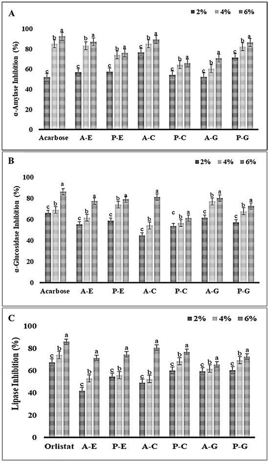 The antidiabetic potential of in vitro digest was evaluated through their ability to inhibit key digestive enzymes, including α-amylase, and α-glucosidase. Furthermore, lipase inhibitory activity was also measured as previously mentioned.