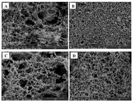 Scanning electron microscopic (SEM) images of surimi gels incorporated without and with 6% of A–C conjugate powder. (A) Control threadfin bream surimi gel without A–C conjugate powder; (B) threadfin bream surimi gel incorporated with 6% of A–C conjugate powder; (C) control Indian mackerel surimi gel without A–C conjugate powder; (D) Indian mackerel surimi gel incorporated with 6% of A–C conjugate powder.
