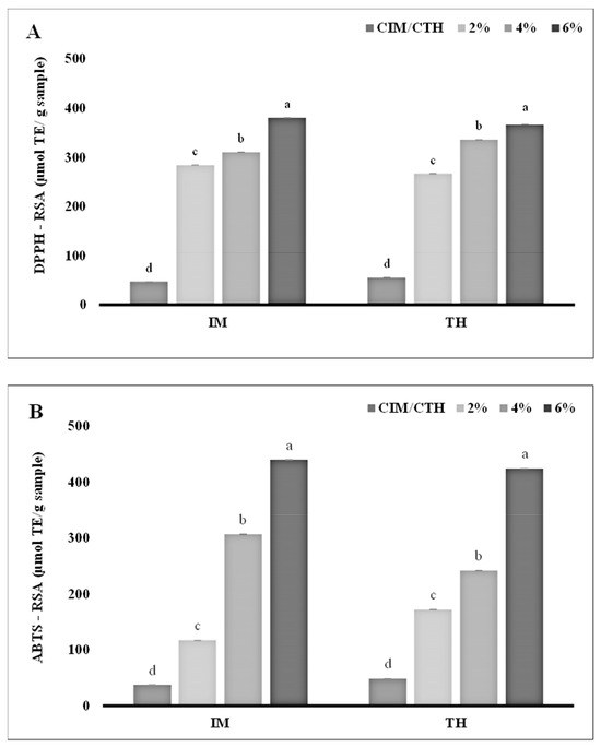 The DPPH-RSA and ABTS-RSA of in vitro digests of IM and TH surimi gel, enriched with A–C at varying concentrations (2, 4, and 6%; w/w), are shown in Figure 5A and Figure 5B, respectively. A clear dose-dependent increase has been observed in both assays. At the highest A–C concentration (6%), the DPPH-RSA reached 379.94 μmol TE/g sample for IM surimi gel and 366.13 μmol TE/g sample for TH surimi gel. Similarly, the ABTS-RSA peaked at 6% A–C with a value of 439.44 μmol TE/g sample for IM and 423.63 μmol TE/g sample for TH, underscoring the substantial increase in free radical neutralization potential. In general, The DPPH-RSA and ABTS-RSA assays primarily evaluate the hydrogen-donating ability of antioxidants in aqueous and lipophilic environments, respectively [59]. Here, peptides derived from the SSPHs function as H-donor, stabilizing the free radicals and effectively inhibiting radical chain propagation [59]. Moreover, the presence of hydroxyl groups in catechin are known to contribute to their potent antioxidant properties, effectively neutralizing free radicals [60]. The antioxidant activity of the conjugated protein hydrolysates, underscoring synergetic effect was responsible for leading a significant increase in DPPH-RSA and ABTS-RSA of the surimi gel prepared by incorporating A–C conjugate (p < 0.05). These results highlight the substantial enhancement of antioxidant capacity in both surimi types with increasing A–C concentrations (p < 0.05). The higher DPPH-RSA and ABTS-RSA values observed in IM surimi compared to TH surimi could be attributed to differences in the protein matrices of the two fish species, which potentially affect interaction with A–C conjugate [61]. Furthermore, higher hydrolysis via muscle bound proteases in the IM more likely to produce more peptides or hydrolysates from the myofibrillar proteins. Both surimi gel types, however, demonstrated consistent, concentration-dependent antioxidant enhancement, confirming the efficiency of A–C conjugate in advancing the functional properties of surimi gels.