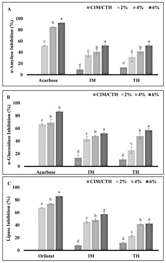 Inhibitory activity of in vitro digests prepared from surimi gels incorporated with varying concentrations of UAH and catechin (A–C) conjugate at various levels of various digestive enzymes such as α-amylase (A), α-glucosidase (B), and pancreatic lipase (C). Bars represent standard deviation (n = 3). Lowercase letters on the bars indicate a significant difference in the different concentrations of the same sample (p < 0.05). Abbreviations: CIM: Control Indian mackerel surimi gel, CTH: control threadfin bream surimi gel. Numbers indicate the amount added into surimi gels in percentage.