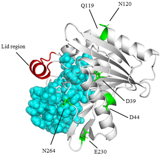 RML homology modeling diagram: the structure in red represents the lid, mutation sites are represented as green sticks, and residues within 5 Å of the catalytic triplet are represented as cyan spheres.